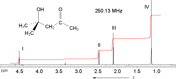 Als Beispiel sehen Sie hier das Spektrum von: Sie sehen über dem Spektrum die Integralkurve, die die relativen Intensitäten der Signale quantitativ wiedergibt.